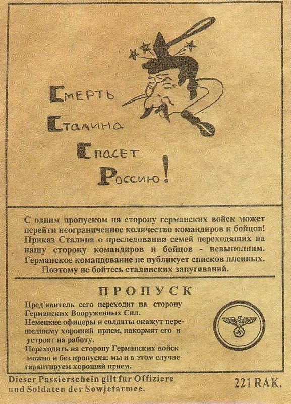 In June 1941, Hitler’s troops invaded the Soviet Union and began distributing a leaflet which carried the same slogan: ‘Stalin’s Death will Save Russia!’, it proclaimed, and went on to provide a tear-off voucher guaranteeing safe passage for any Red Army soldier wishing to defect.